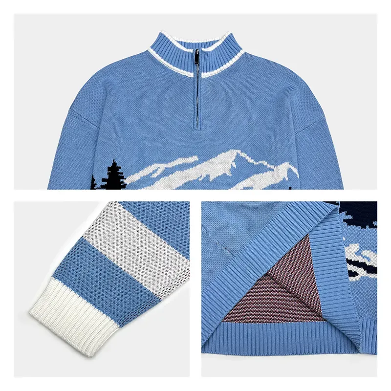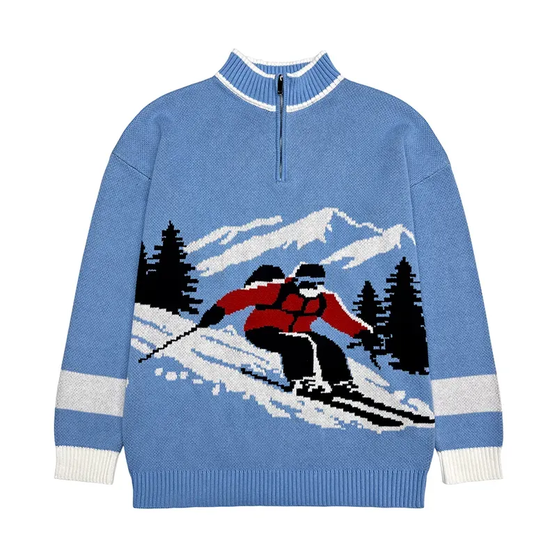 - Alpine Skier Intarsia Quarter-Zip Sweater: Relaxed Fit Graphic Mountain Motif Sporty Knit Jumper