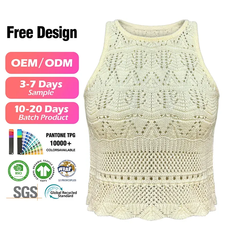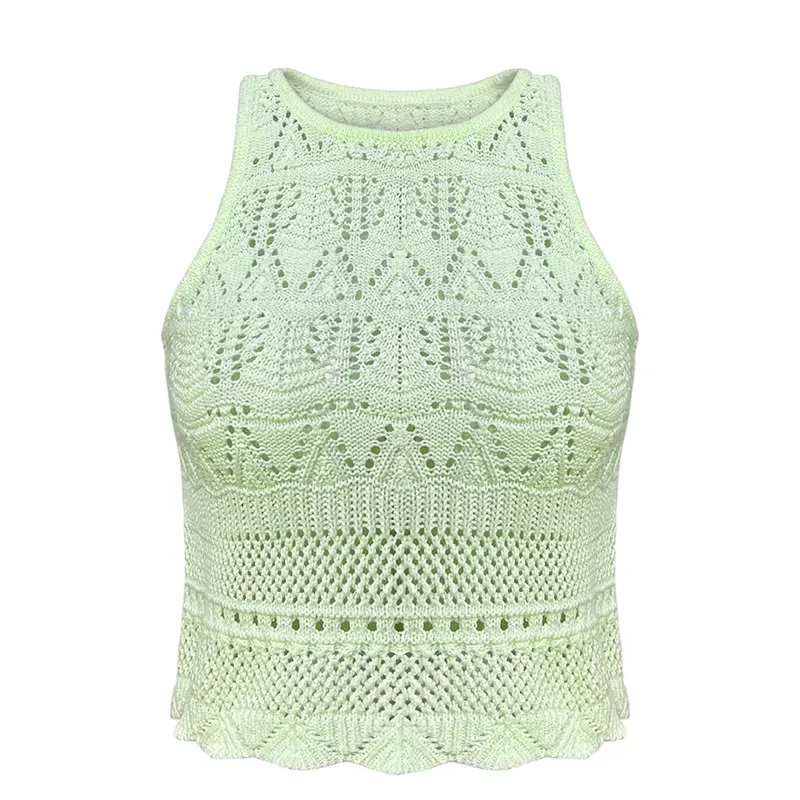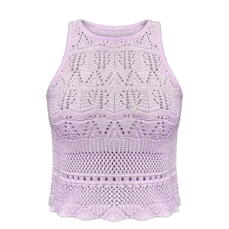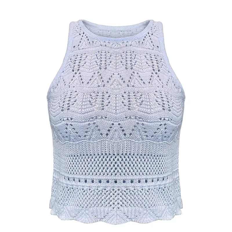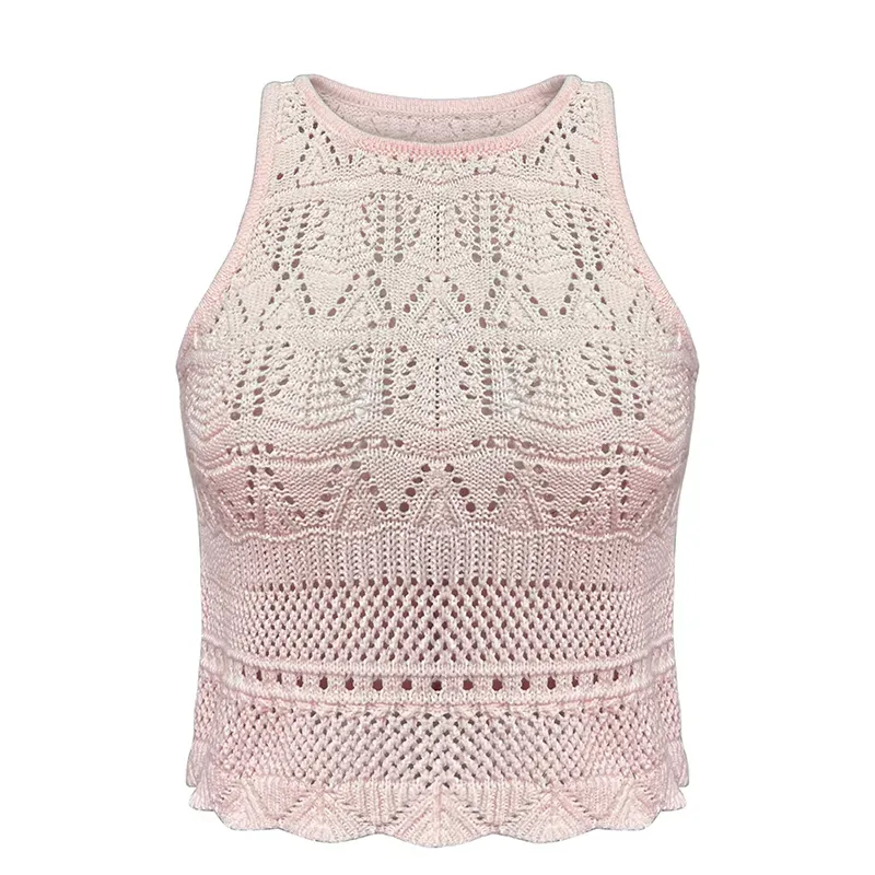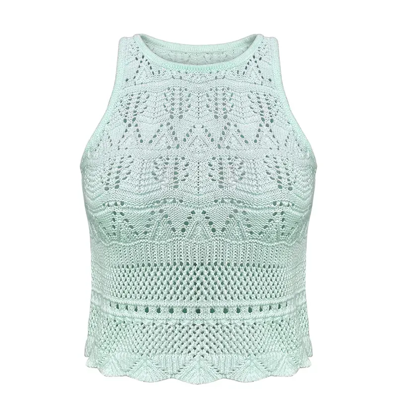 - Cropped Pointelle Knit Sleeveless Vest: Geometric Leaf Mesh Scalloped Hem Halter Tank