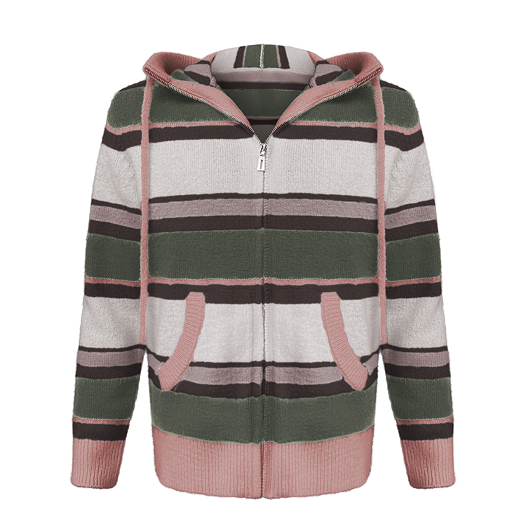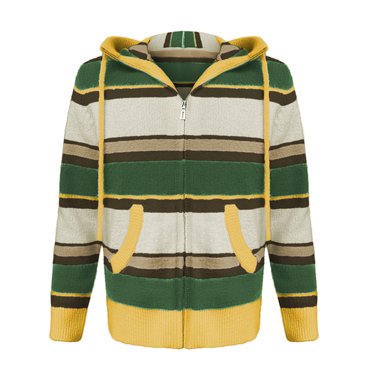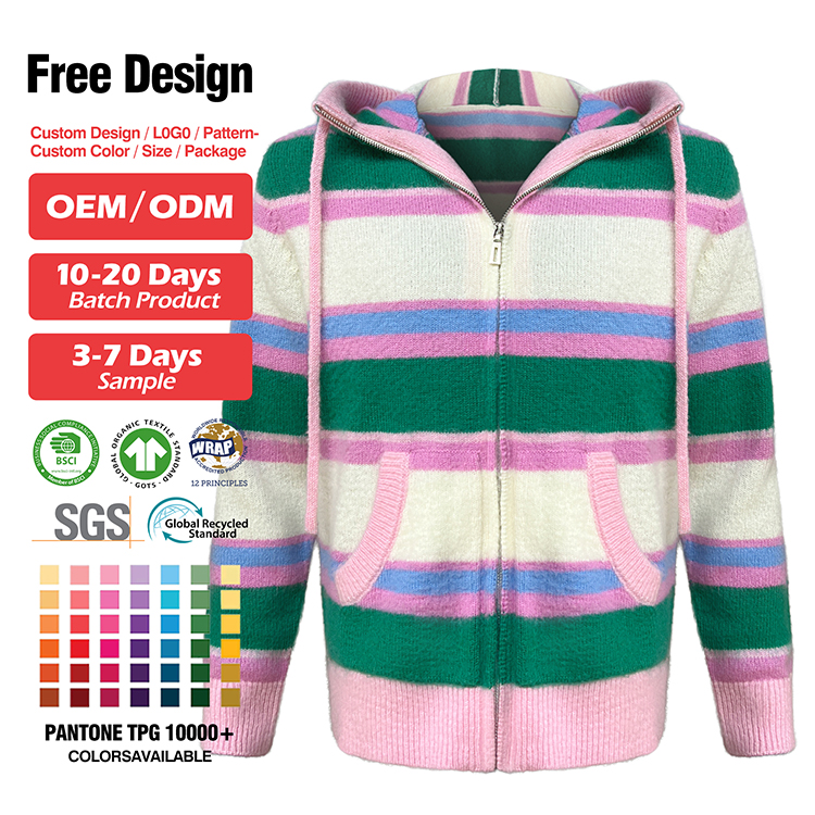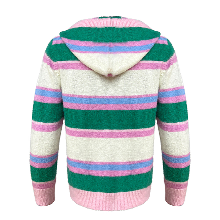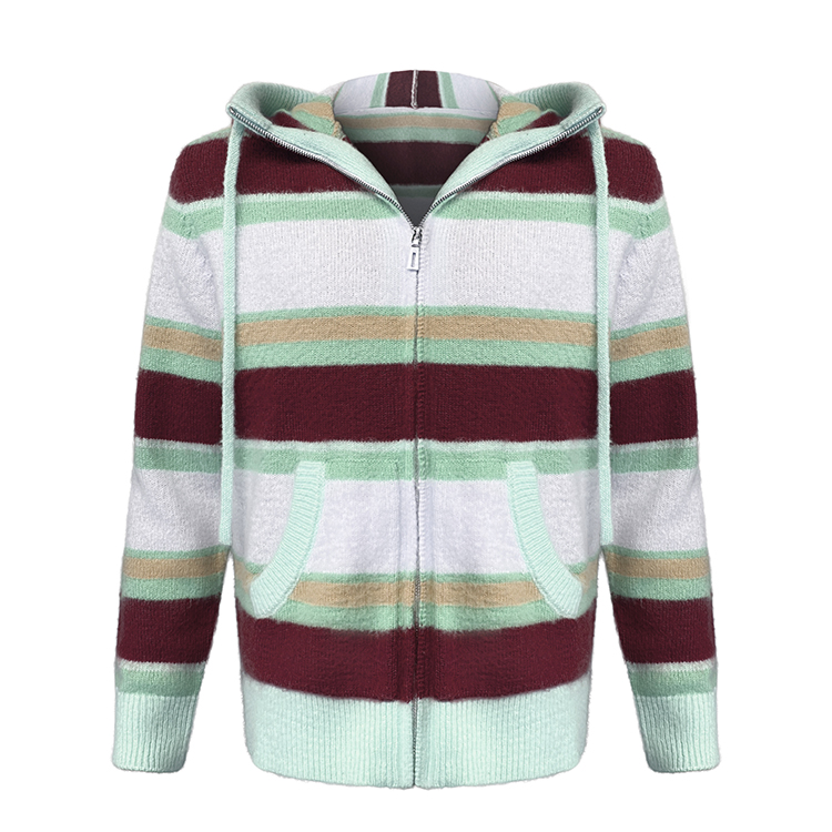 - Custom LOGO Mohair Hoodies Men Sweater Long Sleeve Knitwear Fuzzy Knitted Striped Mohair Jacket Hooded Cardigan