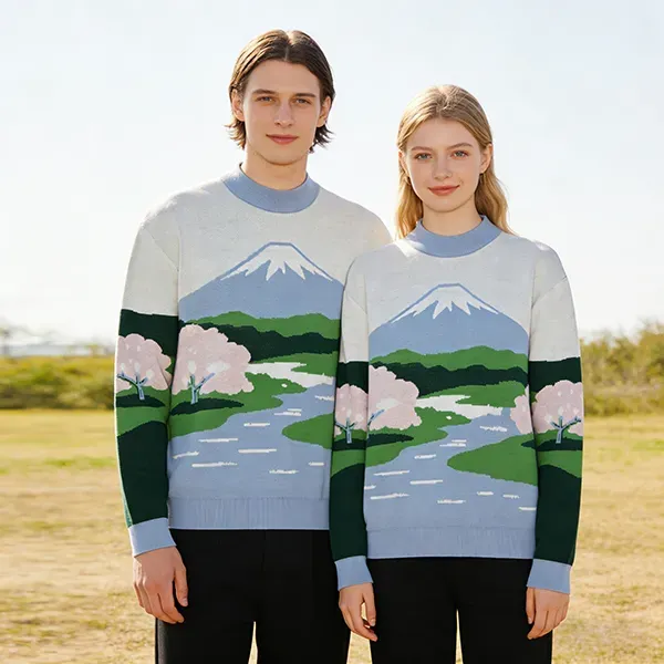 Core Technique: High-Definition Intarsia. This garment features precision color-blocking to render the mountain, river, and forest scenery. The intarsia method ensures a clean, float-free interior for maximum comfort and a premium finish.