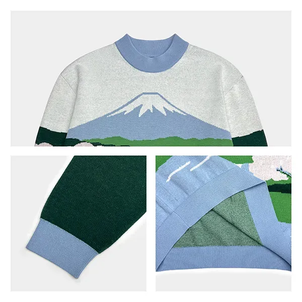 Expertly engineered by JM Sweater Manufacturer. Drawing on 20 years of technical expertise in high-complexity graphic knits, we guarantee that the intricate scenic proportions are perfectly scaled and maintained across all sizes from XS to XXL.