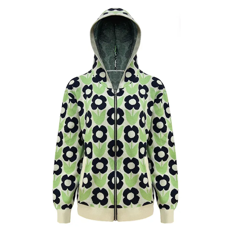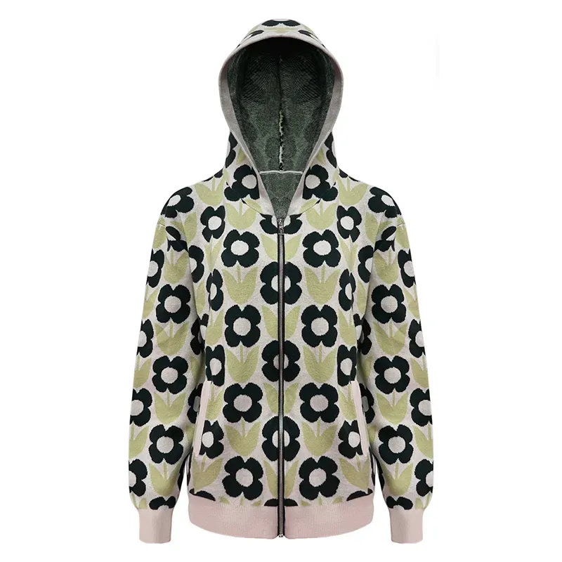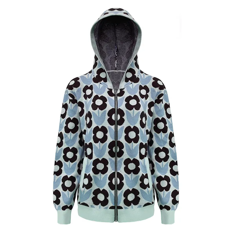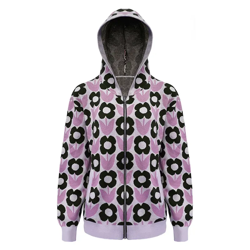 - Oversized Jacquard Zip-Up Hoodie: Retro Bold Bloom Motif Plump Double-Knit Sweater