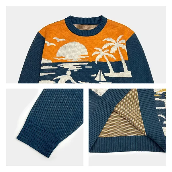 - Vintage Sunset Surf Intarsia Knit: 7GG Heavyweight Beach Scene Streetwear Sweater